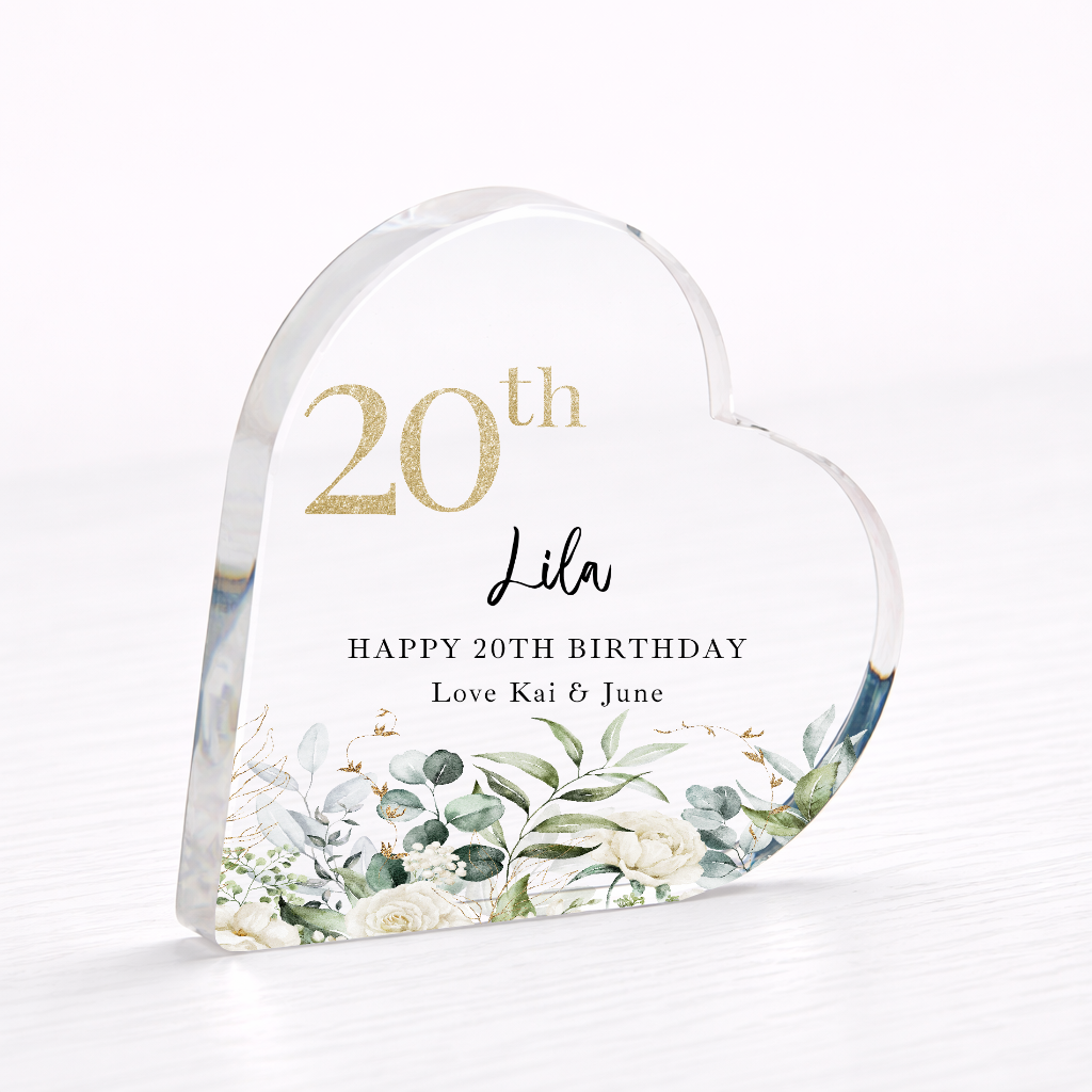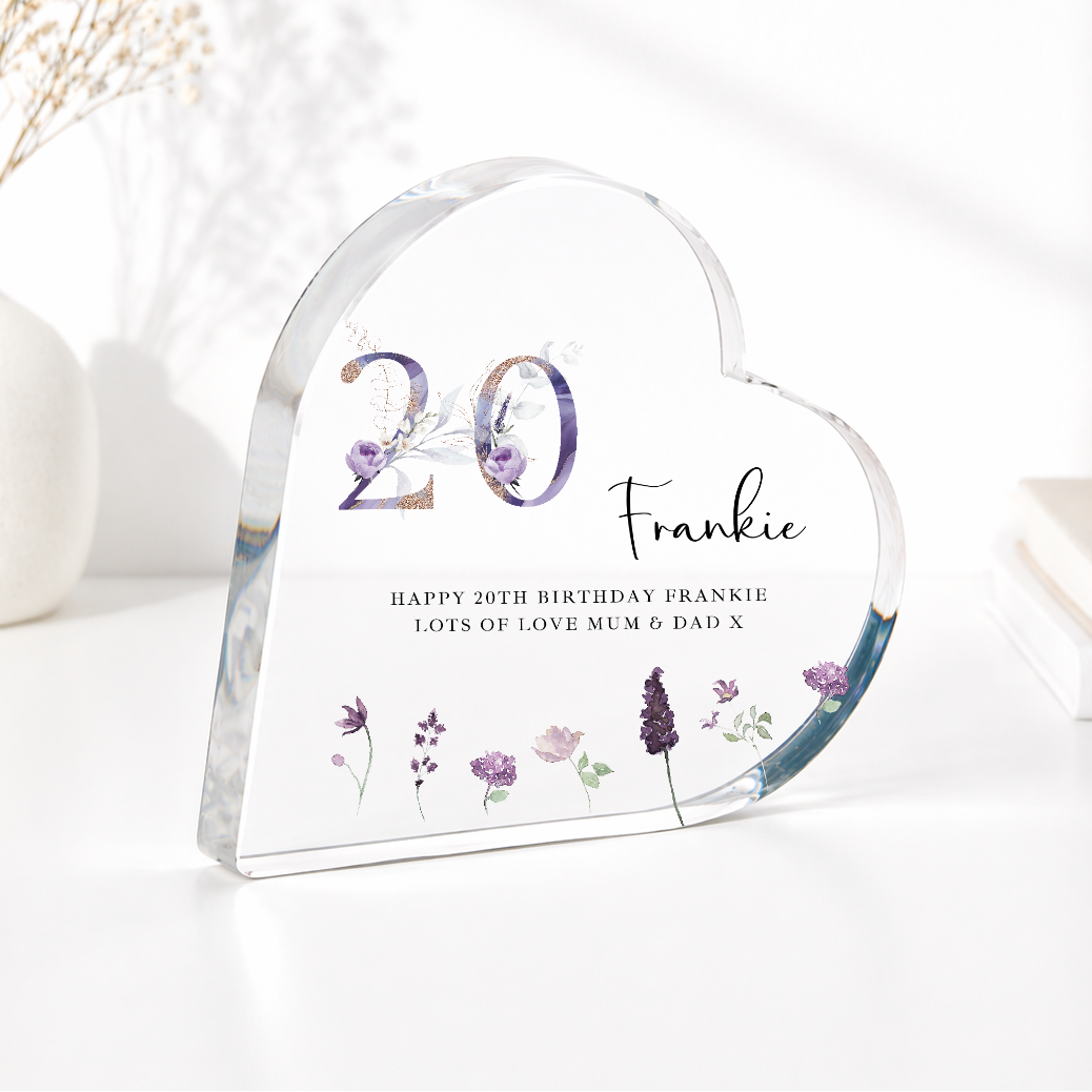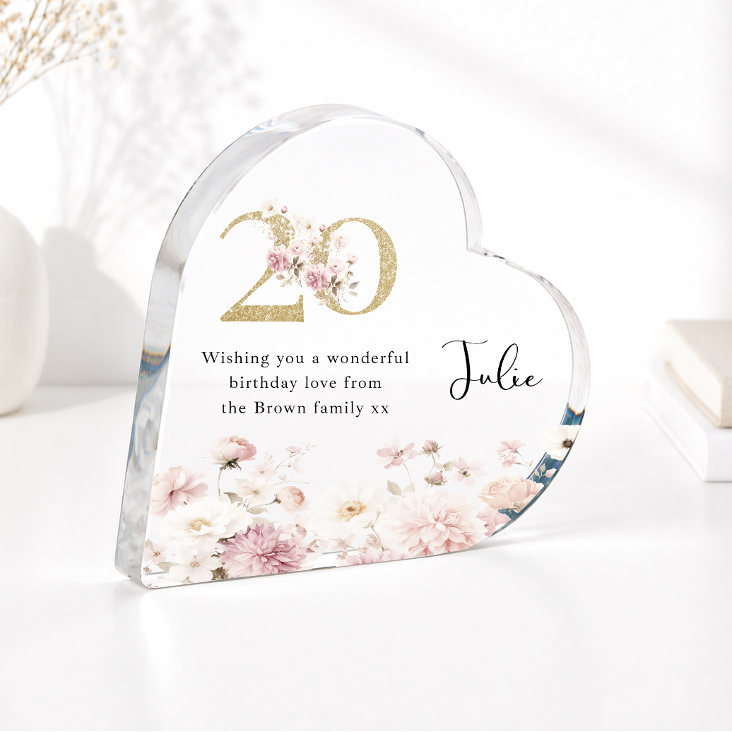 Personalised 20th Birthday Pink Floral Acrylic Heart