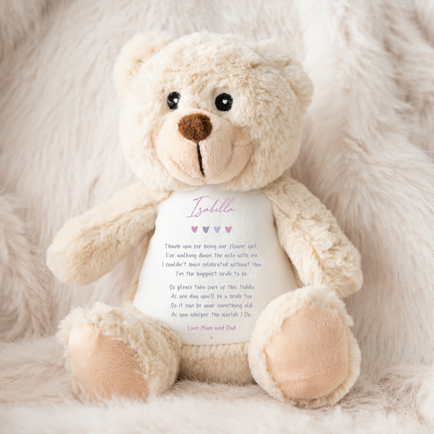 This 23cm personalised Flower Girl teddy or bunny makes a charming keepsake to celebrate your special day. Crafted with attention to detail, it offers a soft, cuddly companion for your flower girl, personalised to add a meaningful touch. Perfect for commemorating weddings, this adorable gift balances sentiment and quality, ensuring a lasting reminder of the occasion.