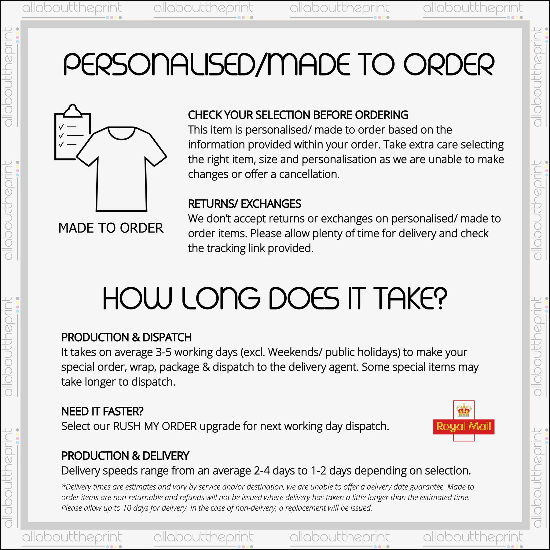 This listing contains made-to-order or personalised products. These are created based on your order specifications and are not eligible for return or exchange.