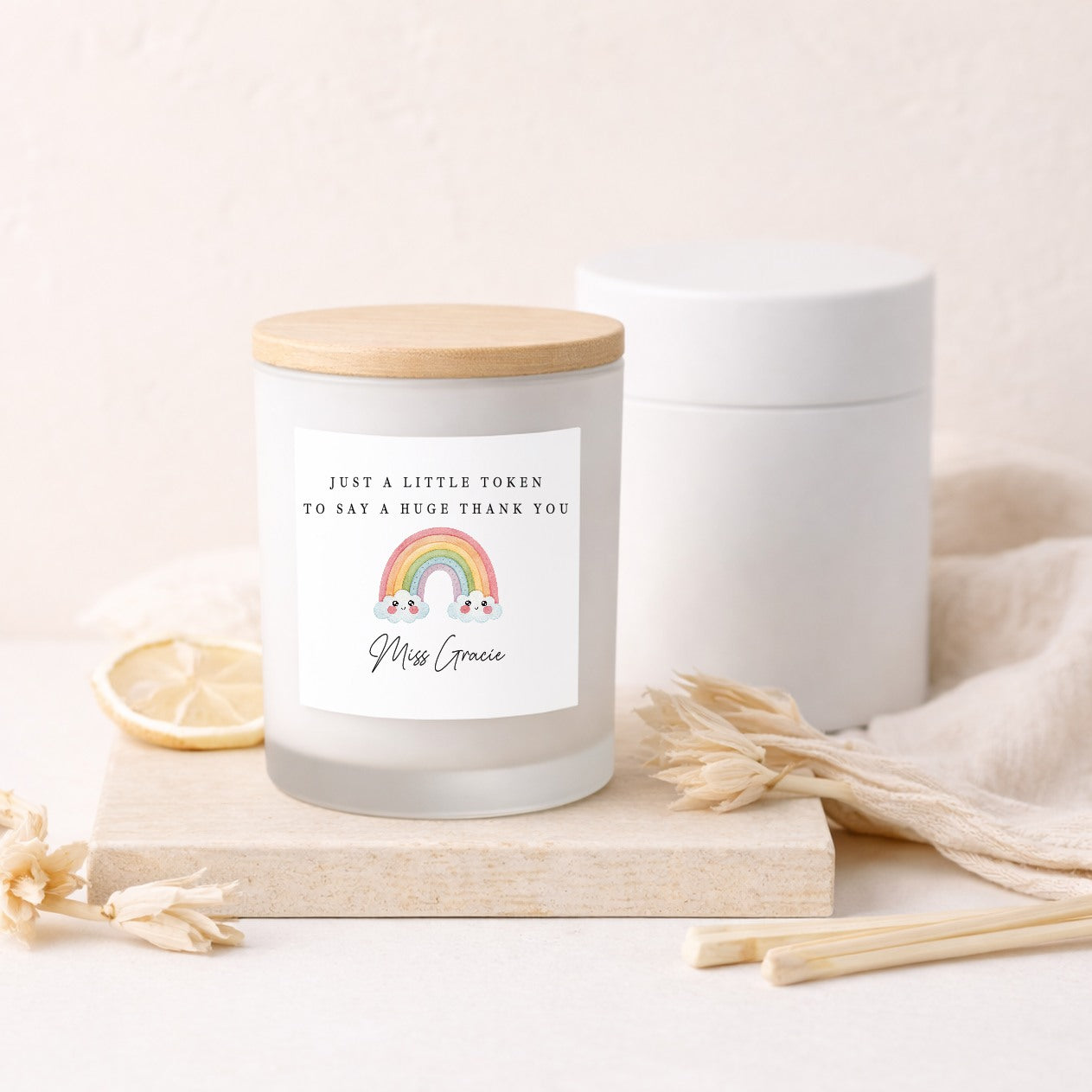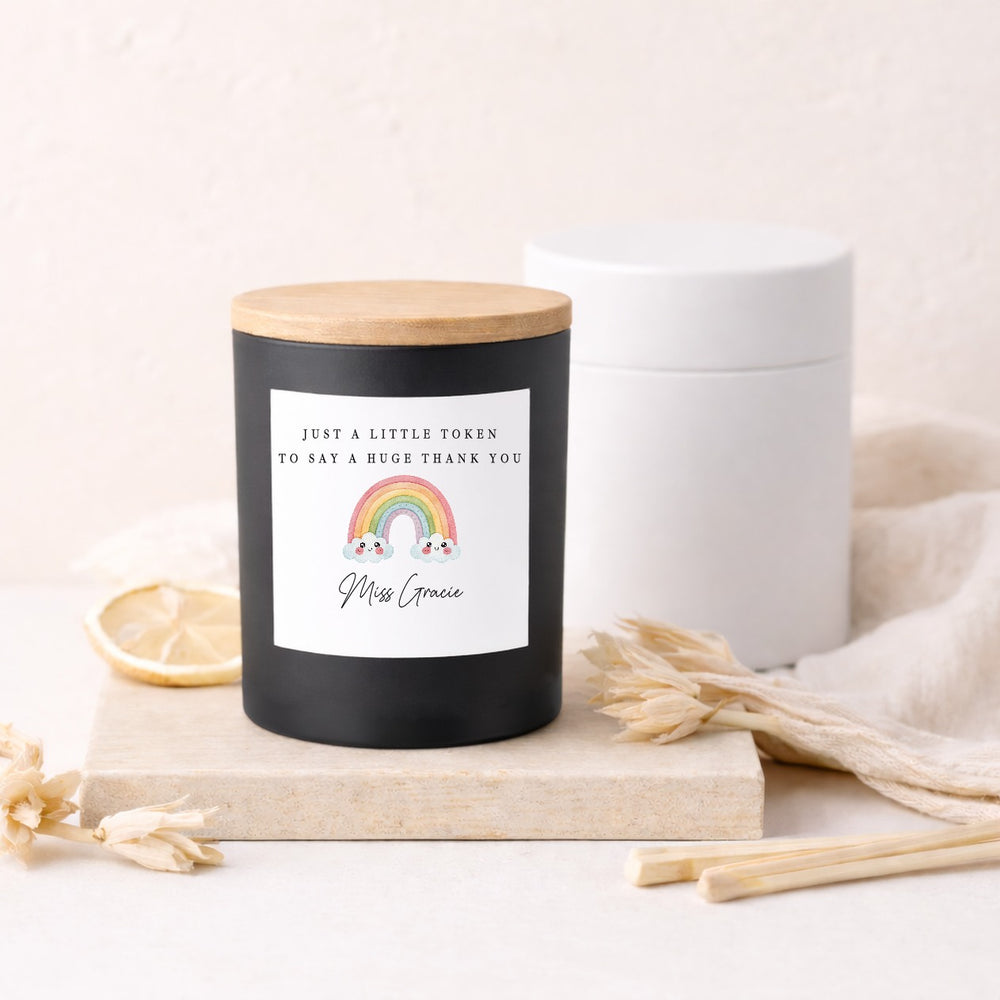 A sweet and thoughtful personalised teacher candle, perfect for saying thank you in a meaningful way. Featuring the message “Just a little token to say a huge thank you” with a cute rainbow design and your chosen name, this candle makes a lovely keepsake for teachers, teaching assistants or nursery staff.