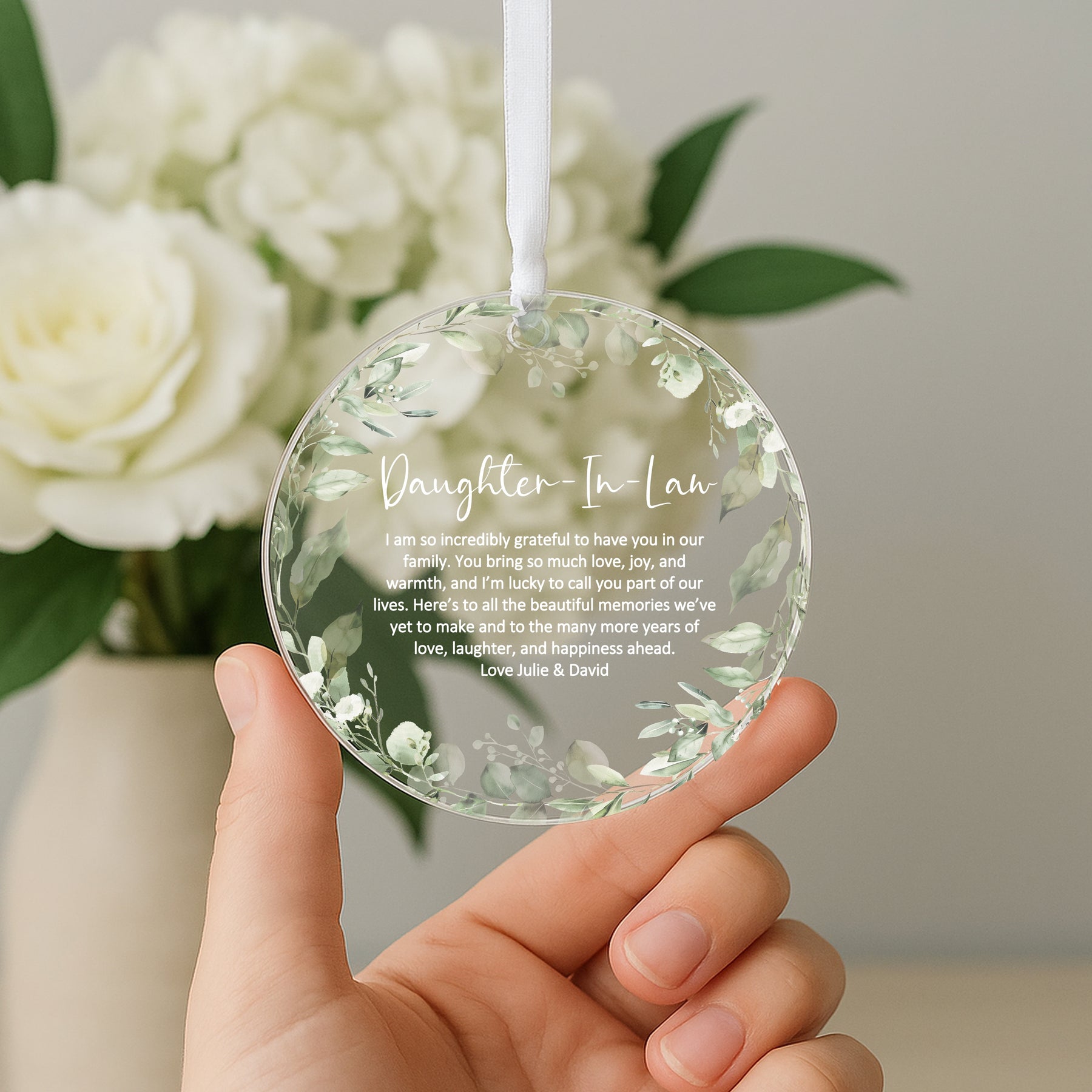 Whether you're welcoming her into the family or simply showing how much she means to you, this Daughter-in-Law gift ornament offers a heartfelt and elegant touch. Professionally UV printed for a crisp, long-lasting finish, it’s lightweight, beautifully made, and designed to be cherished. A perfect keepsake for a new daughter-in-law, engagement celebrations, or thoughtful holiday gifting.