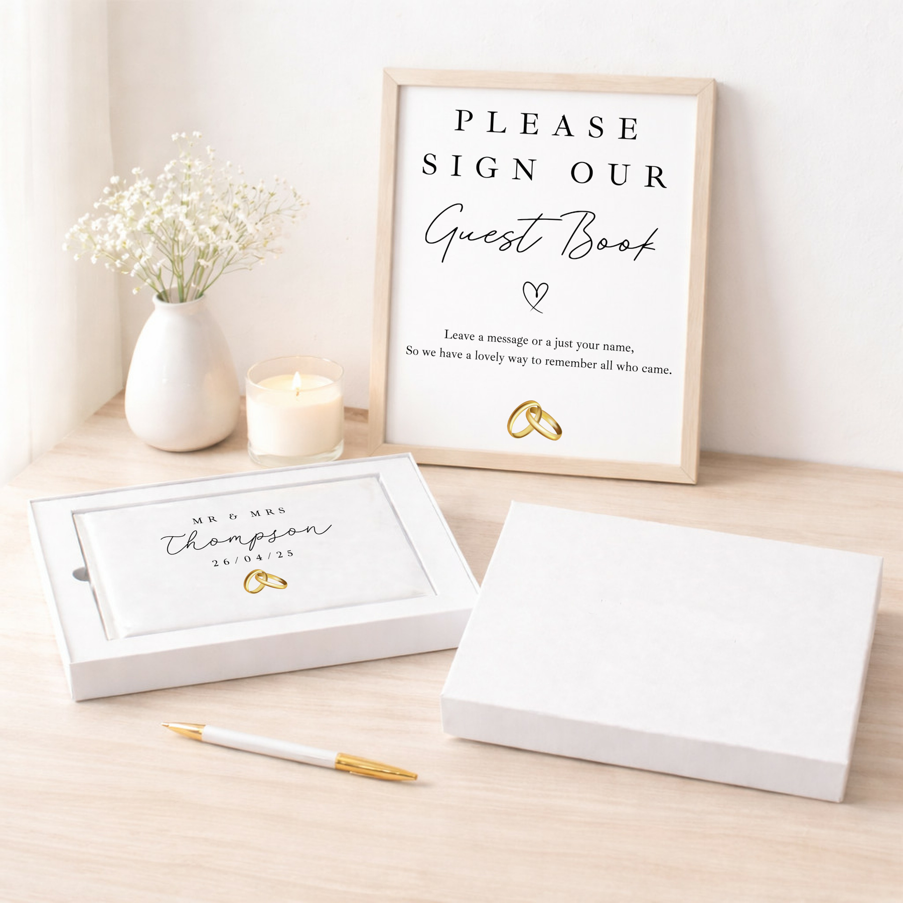[] Optional Add-On: Include a matching 'Please Sign Our Guest Book' sign to help guide guests to leave their notes and messages.